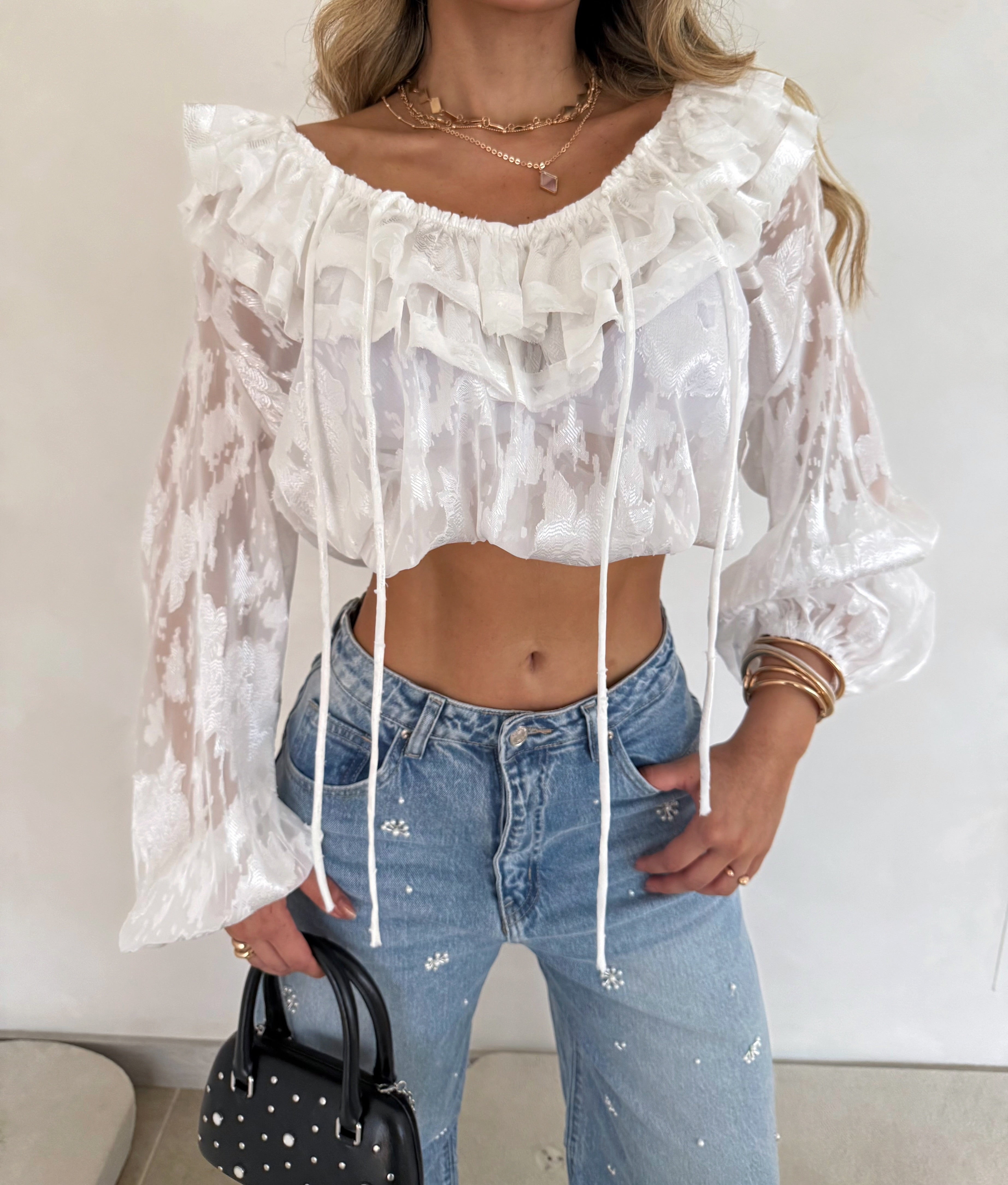 Blusa en encaje texturizado con diseño femenino y delicado que realza tu silueta sin perder comodidad. Su amarre frontal permite ajustarla a tu medida, adaptándose perfecto a diferentes tipos de cuerpo.